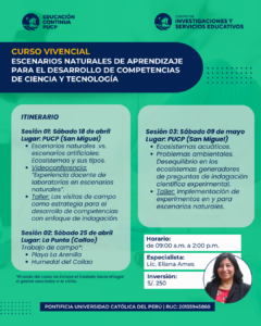 Este curso vivencial busca enriquecer la enseñanza de las ciencias mediante el uso pedagógico de entornos reales como parques, huertos, comunidades, espacios urbanos y ecosistemas locales. A lo largo del curso, se abordarán estrategias para planificar salidas de campo con propósito pedagógico, integrar problemas auténticos del entorno, recoger y analizar evidencias, y evaluar el desarrollo de competencias científicas y tecnológicas en situaciones reales. Al término, se diseña una secuencia didáctica aplicable a su contexto educativo, que articule currículo, indagación y evaluación formativa en escenarios naturales de aprendizaje.